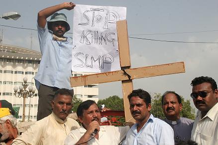 Relatives look over the bodies of fifteen Christians in a makeshift morgue in Bahawalpur on October 28, 2001 after masked gunmen on motorcycles sprayed a Pakistan church congregation with machine gun fire. Christians have long expressed fears they could become targets if unrest broke out in Muslim Pakistan over opposition to the U.S. attacks on neighboring Afghanistan's ruling Taliban militia. REUTERS/Asim Tanvir.